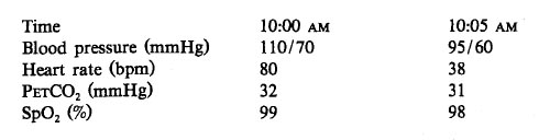 A 46-year-old patient is undergoing resection of a posterior fossa tumor with the head elevated 10 cm above the level of the heart. During the procedure, the following changes in vital signs are observed. Which of the following is the most likely cause of the change in heart rate?